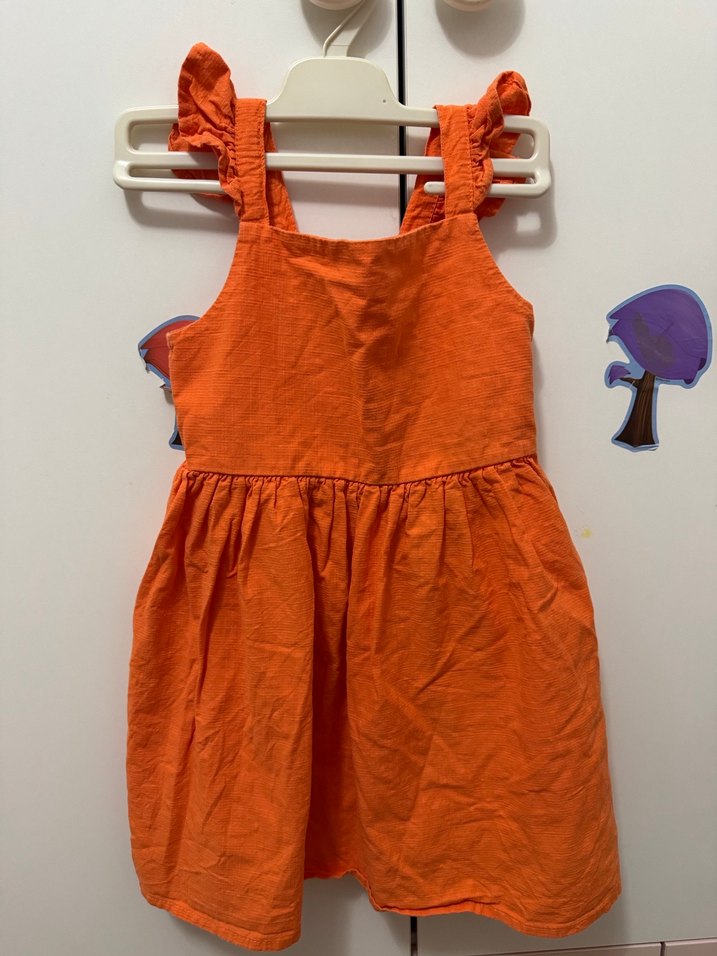 Yumuşak keten kumaştan yapılmış turuncu kolsuz kız elbisesi. Fırfırlı askıları ve rahat bol kesimi vardır. Askısız yaka ve sade, renkli bohem tarzı bulunur.