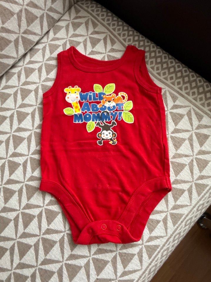 Renkli hayvan baskılı, kolsuz kırmızı bebek body, alt kısmında kolay giydirme için çıtçıtlıdır.