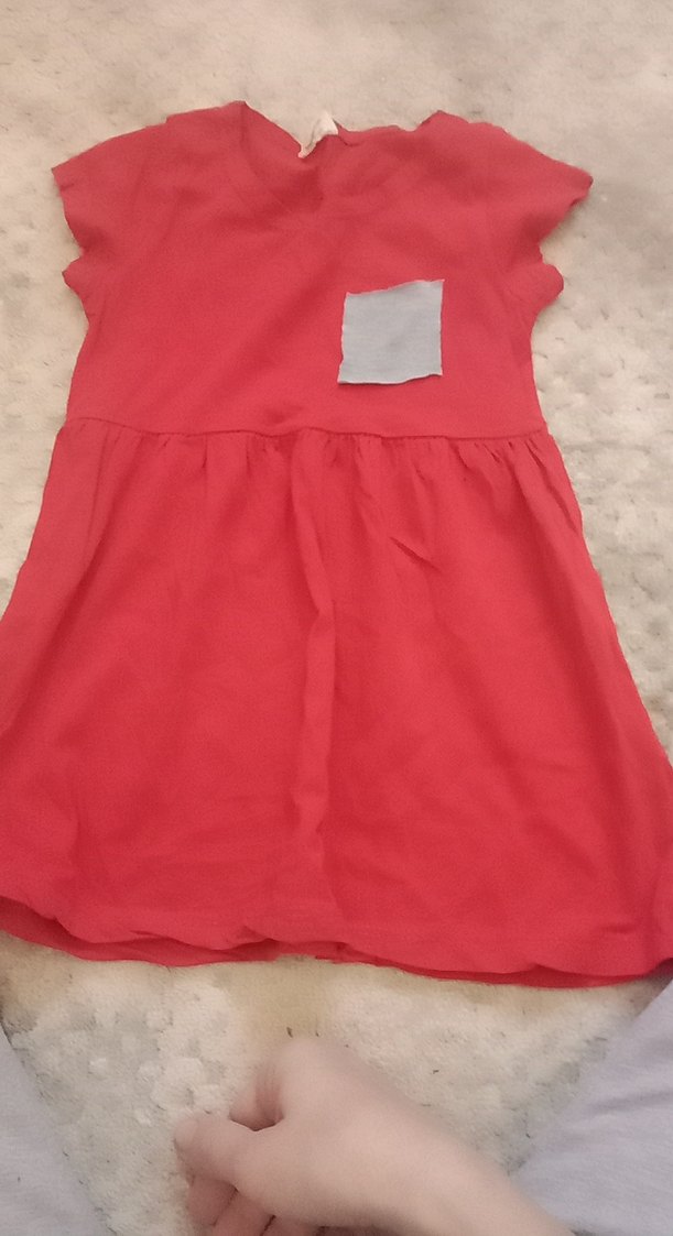 Kolsuz, bol kesim kırmızı kız çocuk elbisesi, yuvarlak yaka ve gri küçük cep detayı ile yumuşak, sıcak kumaştan yapılmıştır.