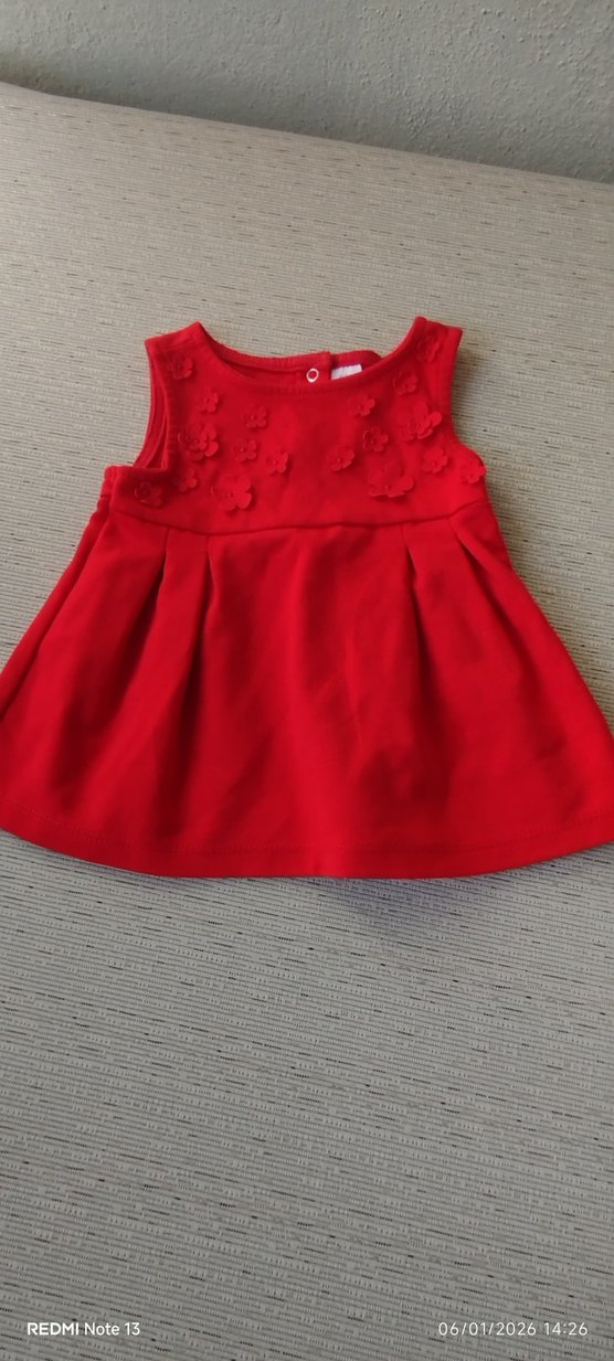 Kolsuz kırmızı kız çocuk elbisesi, yuvarlak yakalı ve vücuda oturan kesime sahiptir. Yumuşak ve sıcak kumaştan, fırfır detaylarıyla sade ve renkli görünüme sahiptir.