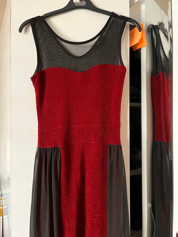 S Beden.Arkası boydan tül.Kolsuz, vücuda oturan, koyu kırmızı midi kına/düğün elbisesi, drapeli ve şeffaf siyah tül yakalı, gotik avant-garde tarzda, parti için uygun.