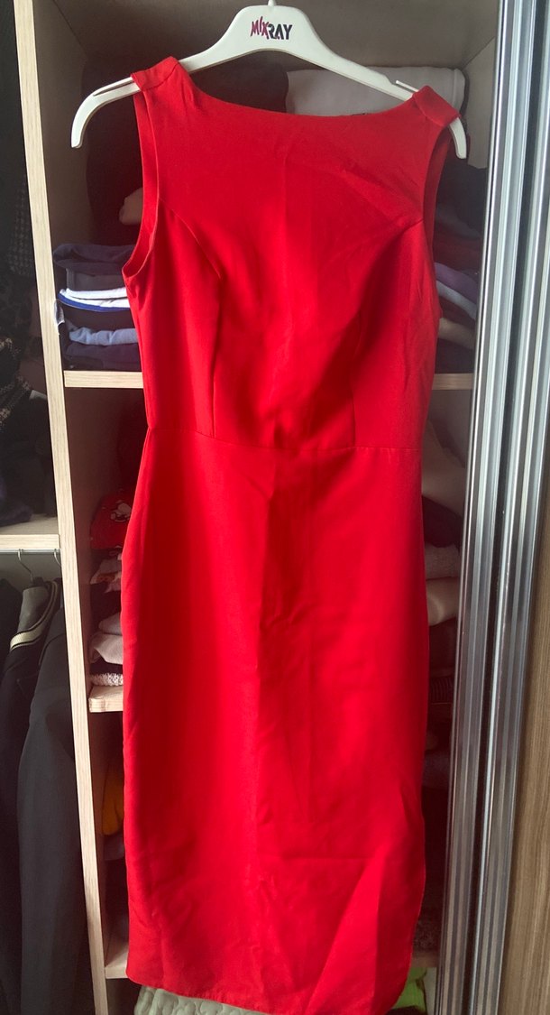 Kolsuz, V yakalı kırmızı midi elbise, drapeli ve vücuda oturan kesimiyle cesur ve minimalist tarz için uygundur.
