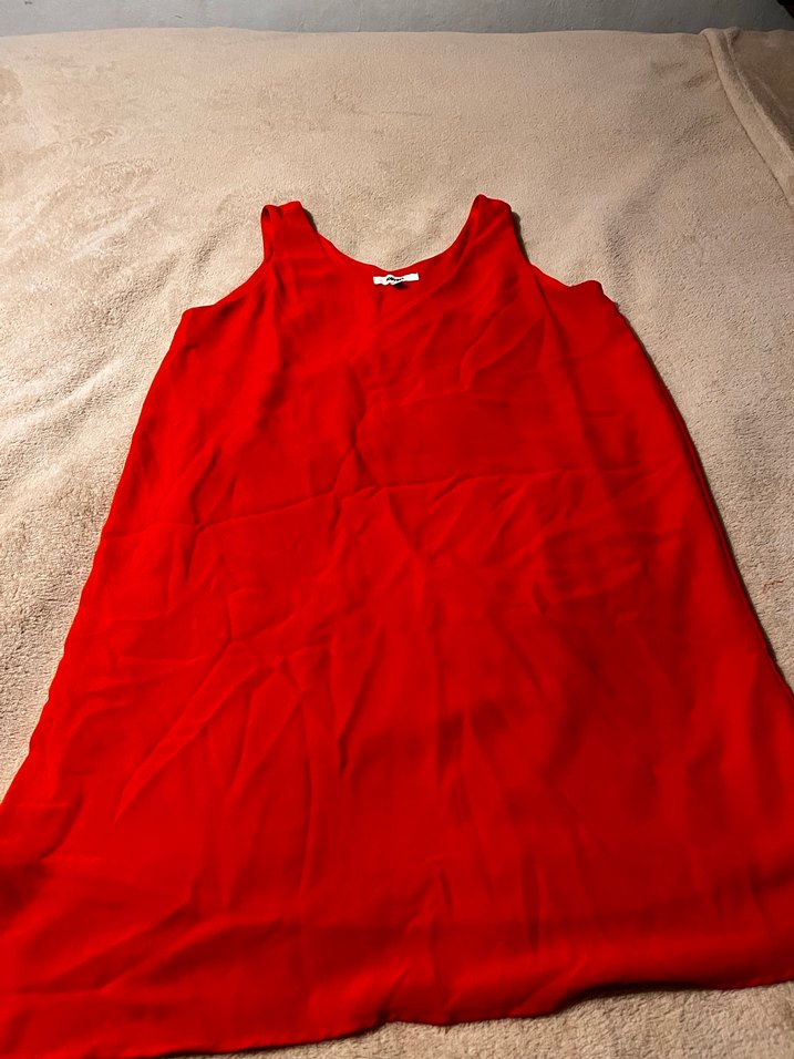 Kolsuz, V yaka, drapeli kırmızı mini elbise, bol kesim ve yumuşak sentetik kumaştan üretilmiştir. Günlük kullanıma uygundur.