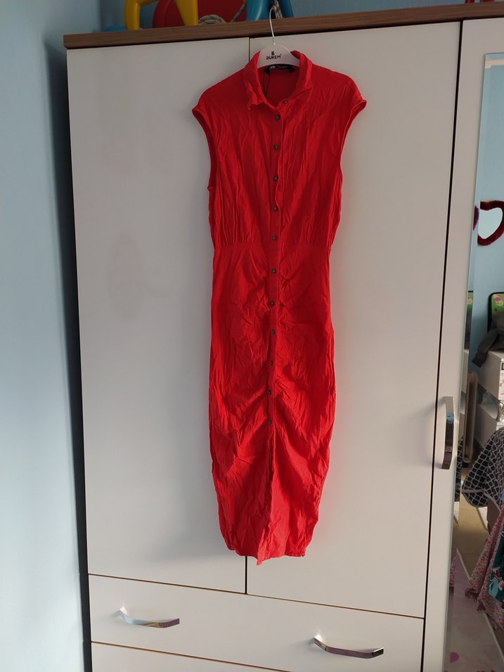 Kolsuz, fitted kesim uzun keten elbise, parlak kırmızı renkte, yüksek yakalı ve drapeli tasarıma sahip. Bohem avant-garde stilini yansıtır.