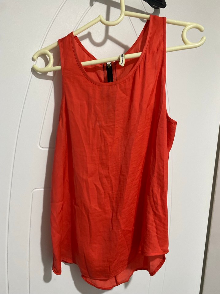 Kolsuz, V yakalı kırmızı keten bluz, drapeli ve bol kesimdir. Parlak görünümlü ve midi boyda, günlük rahat sokak stili için uygundur.