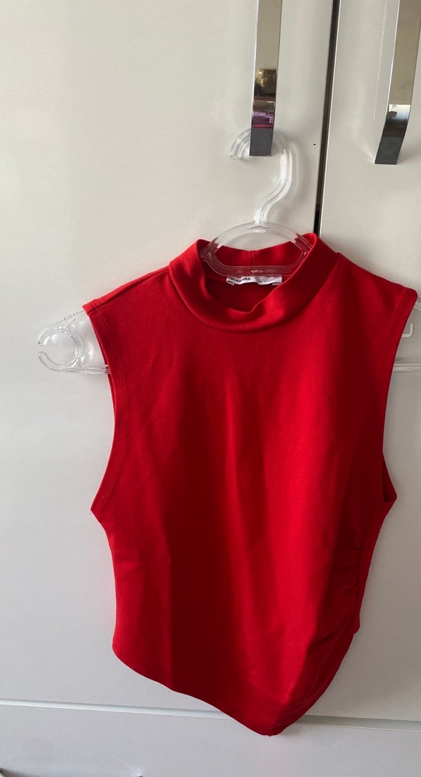 Kırmızı, kolsuz, yüksek yakalı, vücuda oturan ve düz renkli bir hemşirelik body. Normal midi uzunluğundadır. Dar geldiği için hiç giyemedim
