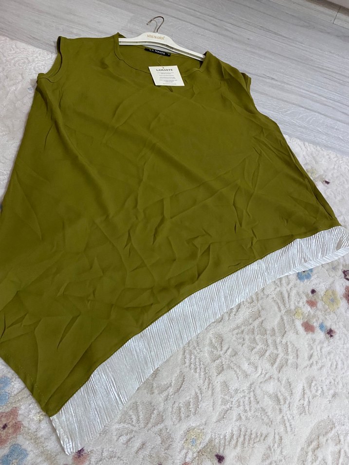 Kolsuz, keten kumaştan, bol kesim ve drapeli, yuvarlak yakalı kısa bluz. Günlük kullanıma uygun rahat bir parça.
