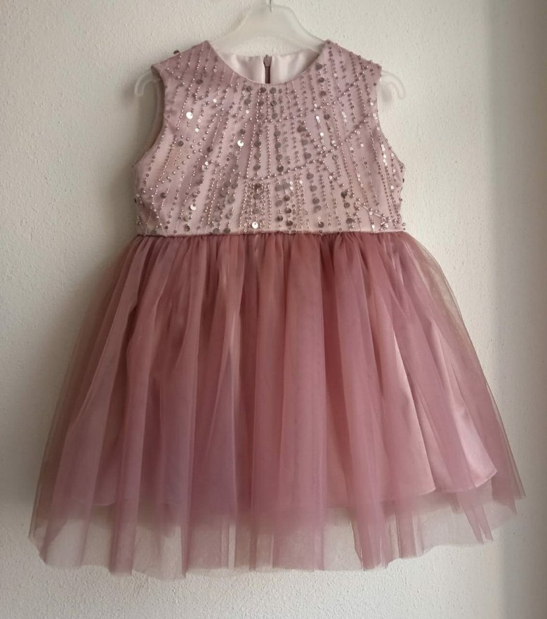 Pembe tonlarında, boncuk işlemeli, kolsuz ve straplez kesime sahip,arkası fermuarlı,eteği Tül astarı saten klasik şıklıkta kız çocuk abiye elbisesi.Özel dikimdir sıfır ürün