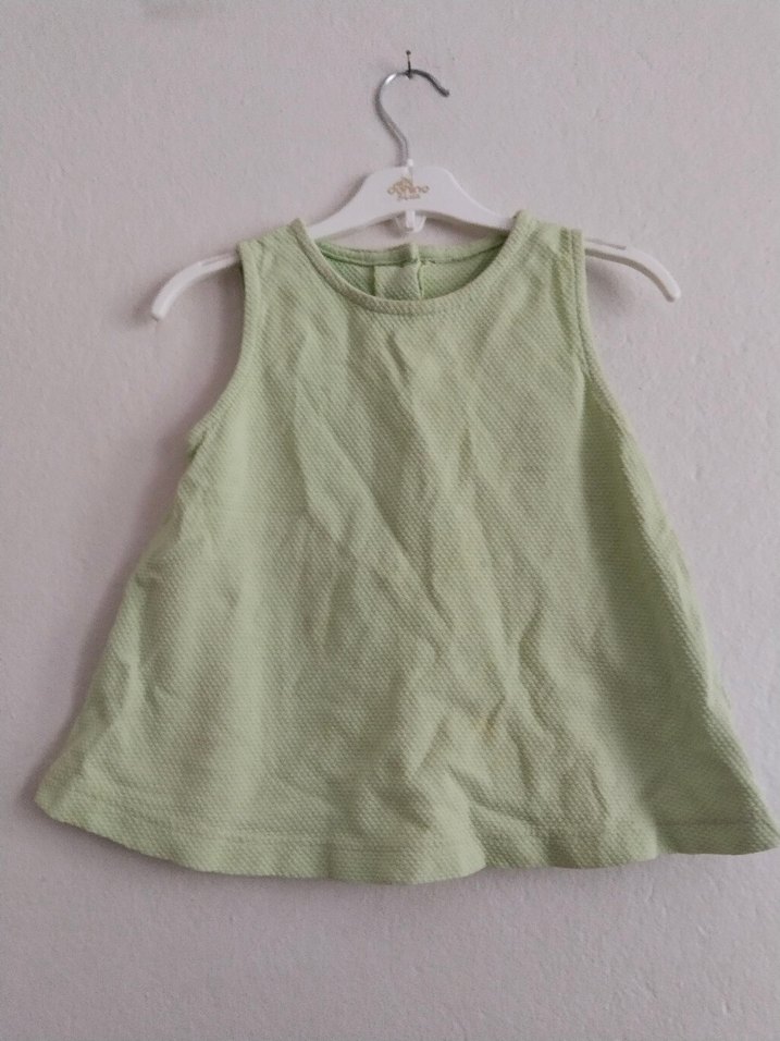 Kolsuz kız elbisesi, yuvarlak yaka ve pileli bol kesim. Pastel yeşil tonu sade ve temel bir stil sunar.