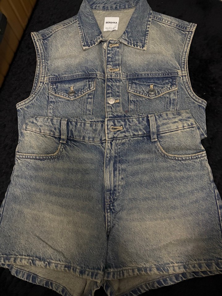 Kolsuz, kot kumaştan yapılmış, belde tokalı, straplez yaka ve midi boyda şort tulum. Günlük sokak stili için uygun koyu lacivert renkte.