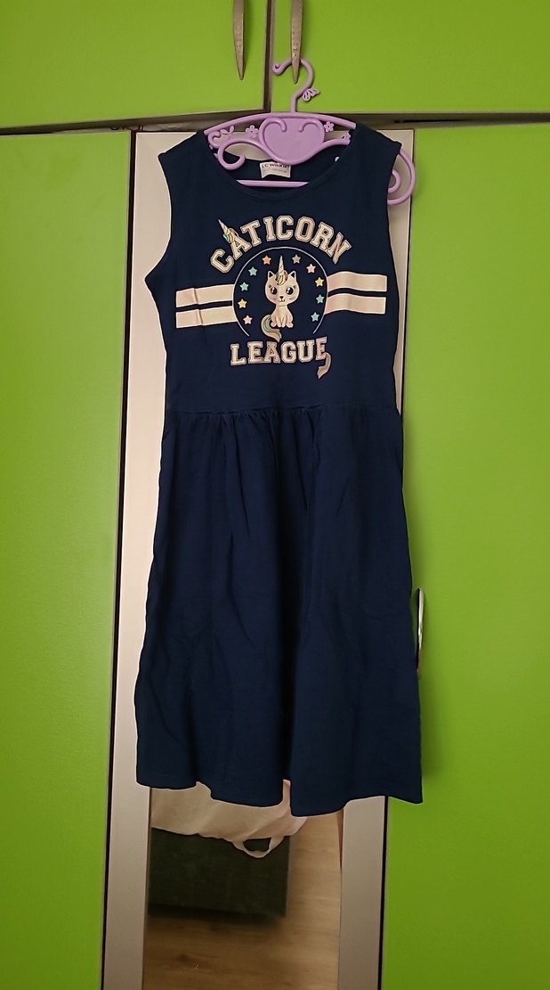 Kolsuz, bol kesim elbise, yuvarlak yaka ve drapeli tasarıma sahip. Pamuk kumaştan yapılmış, önünde 'Caticorn League' baskısı bulunur. Rahat kullanım için uygundur.