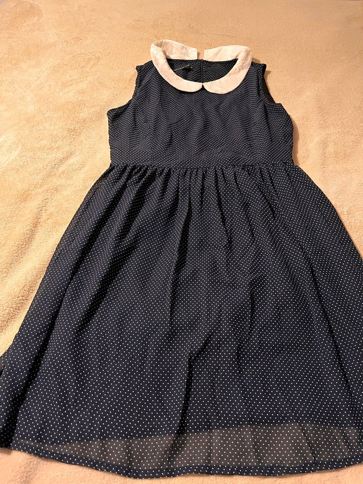 Kolsuz, yakalı ve fırfırlı detaylara sahip lacivert elbise. Sentetik kumaştan, bol kesim ve ince puantiyeli desenlidir.