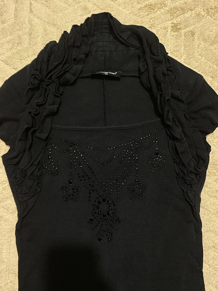 Kolsuz, yüksek yakalı lacivert midi elbise. Fitted kesim, fırfır detaylar ve nakışlı desenler içerir. Gotik ve rahat tarzı birleştirir.