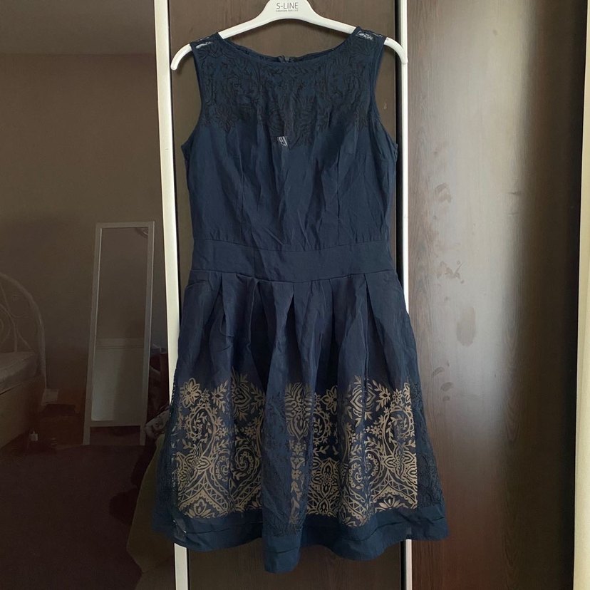 Lacivert, kolsuz elbise, bol kesim ve pilili etek detayları ile vintage desenlere sahip, düğünler için uygun.
