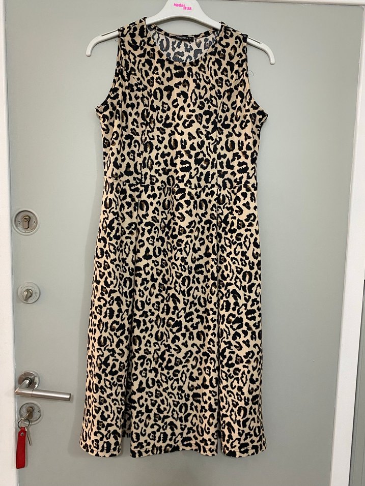 Kolsuz, V yakalı, leopar desenli ve kürklü detaylı uzun elbise. Sentetik kumaştan, hafif kahverengi tonlarında, sokak modasına uygun.