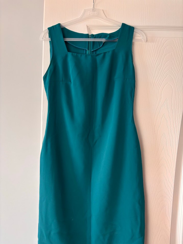Kolsuz, mavi renkte, defosuz ofis elbisesi. Bedeni üzerinde yazmıyor fakat ölçülerini fotoğraflarda görebilirsiniz. 167 cm 58 kilo olan bana kıyafet küçük geliyor olmuyor bilginize.