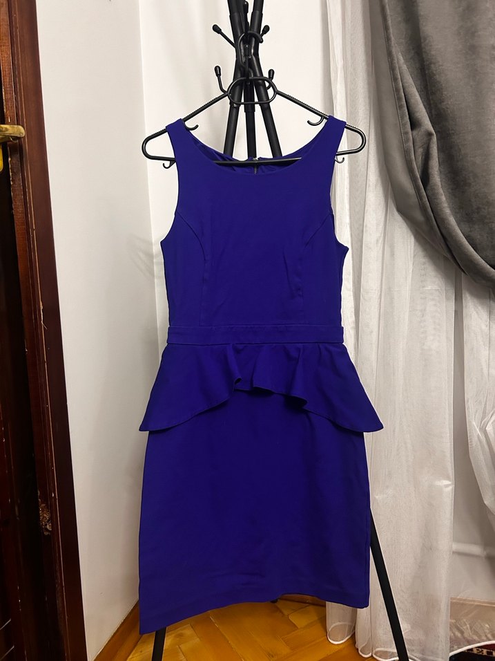Kolsuz mavi midi elbise, V yaka ve bele oturan kesim ile ruffle detayına sahiptir, ofis için uygundur Kalın tok bir kumaş ben düğüne giderken giydim, ince bel büyük kalça da baya sarıyor ve çok şık görünüyor .