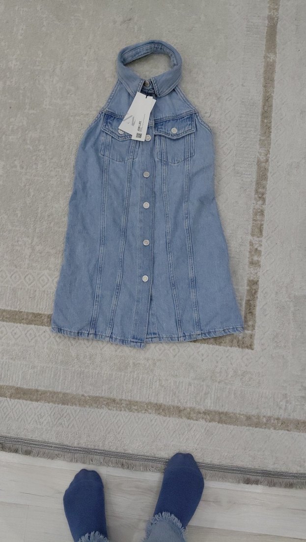 Kolsuz mavi Mini Denim Ceket sırt detaylı