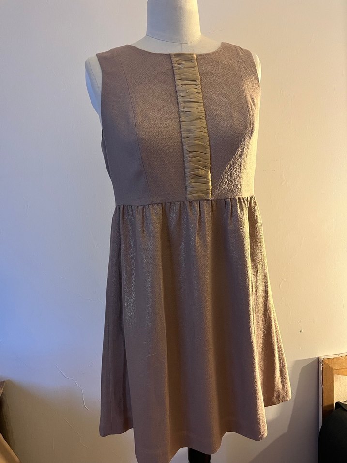 Rengi aslinda pudra rengi ve bej arasi cok guzel bir ton, hafif de simli parlakligi var ama rahatsiz eden cinsten diil. Zarif ve şık. isiktan tonu tam cikmamis. Kolsuz, regular fit ve ofis ve kokteyl için uygun tarzda. Bedeni M ve L icin uygun. Kendinden astarli, esnemeyen kumas. Bolero ile kombinlenebilir, bolero hirka dahil degildir, ayrica satilmaktadir.
