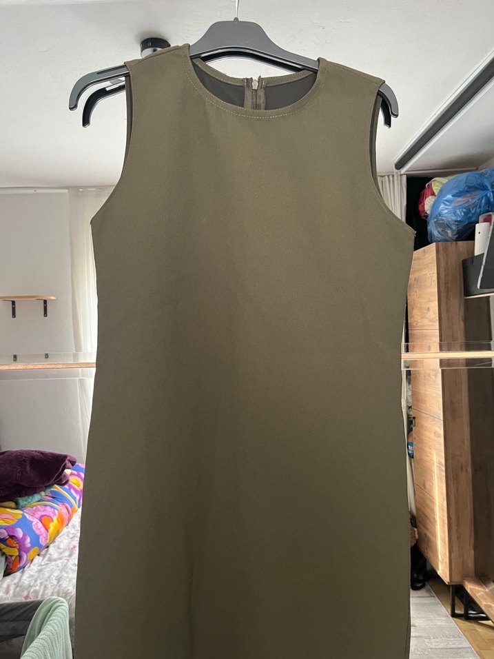 Kolsuz, yuvarlak yakalı haki midi elbise, rahat kalıp ve düz tasarıma sahip. Günlük kullanım için sade ve şık bir model.