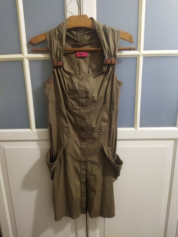 Bej keten kumaştan, kolsuz, midi elbise. Yaka detaylı, düğmeli ön ve cepli vintage bohem tarzda, günlük kullanıma uygun.