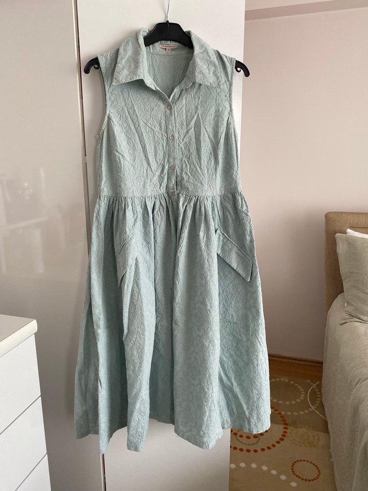 Kolsuz, keten kumaştan yapılmış midi elbise. Yaka detaylı, pileli etekli, bol kesim ve bohem vintage tarzında, pastel bej renkte.