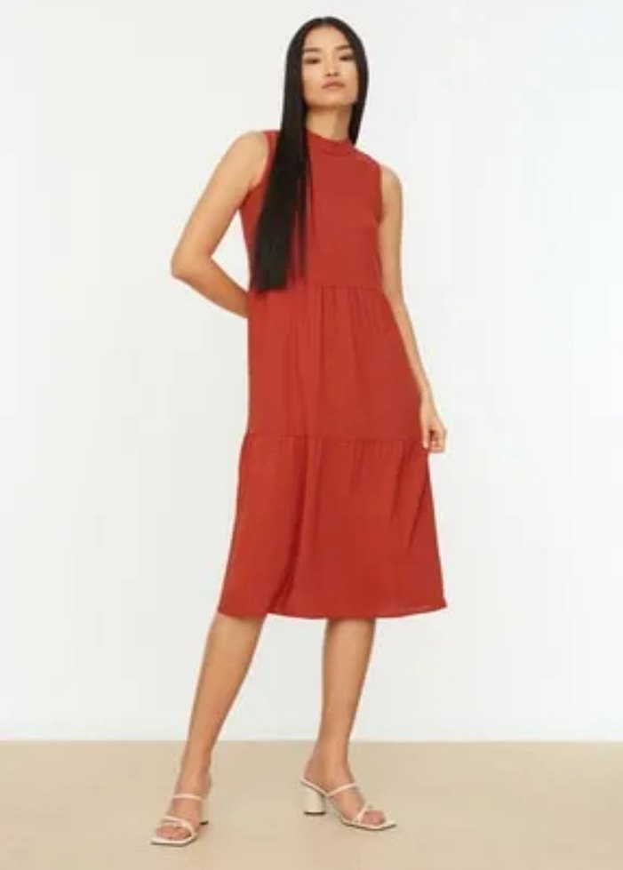 Kolsuz, hafif kırmızı midi elbise, yüksek yakalı ve rahat kesim. Günlük kullanım için yumuşak sentetik kumaştan, trend sokak stiline uygun.
