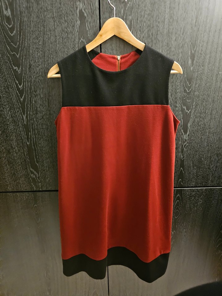 Kolsuz, yuvarlak yakalı midi elbise, düzenli kesim ve kırmızı-siyah sentetik kumaşta drapeli tasarım. Günlük kullanım için çağdaş Paris tarzı.