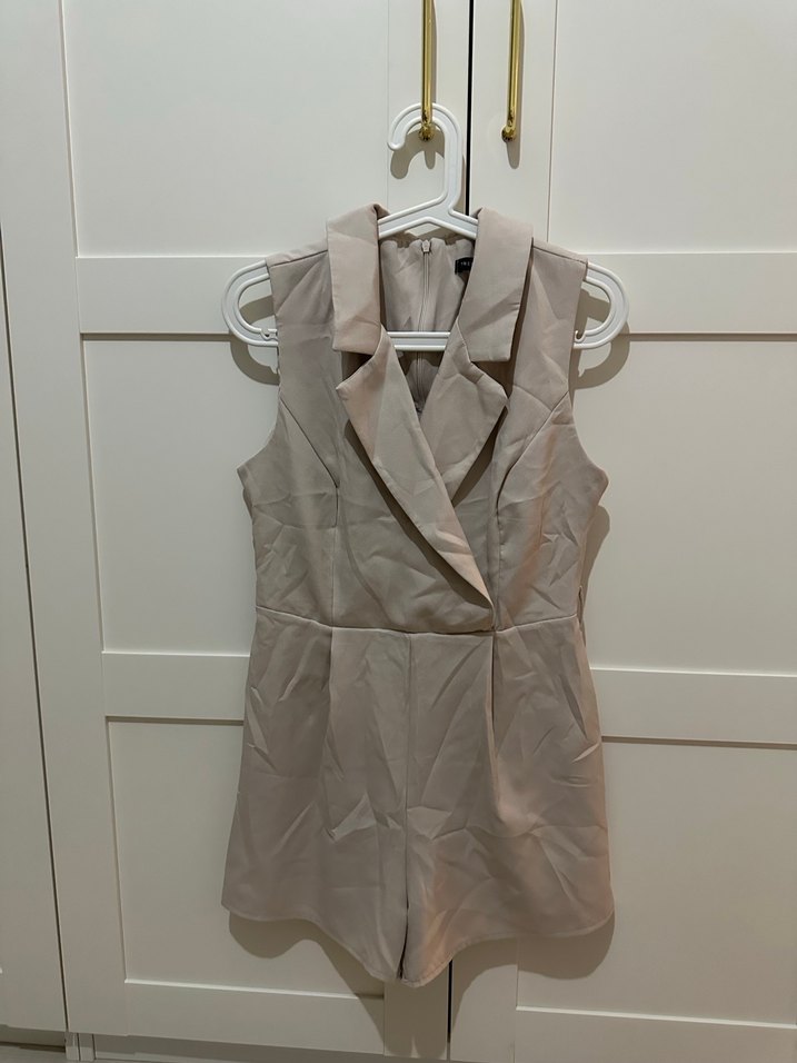 Kolsuz, bej renk midi tulum. Notlu yakalı ve kemerli, düz kesim. Ofis ve günlük sokak stiline uygun, sentetik kumaştan yapılmıştır.