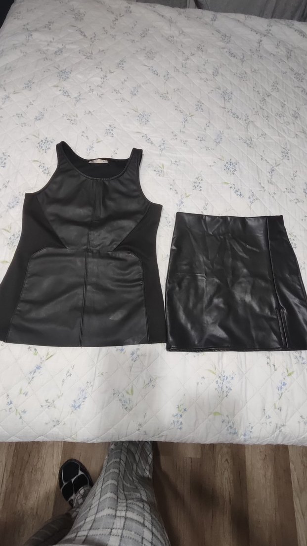 Kolsuz, mini, siyah deri elbise. İnce kesim ve kemerli bel detayıyla minimalist gotik tarzda, ofis için uygun.