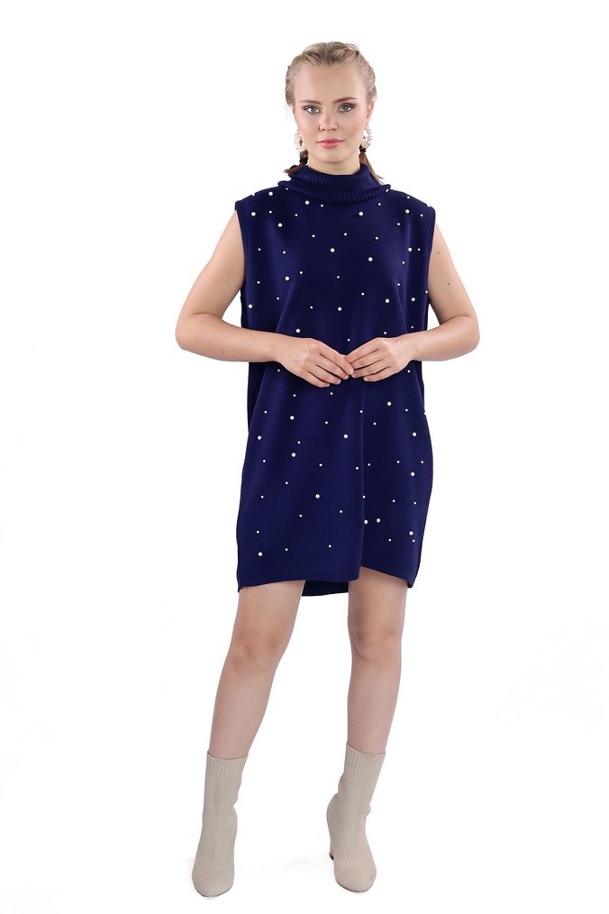 Kolsuz, yüksek yakalı ve bol kesimli lacivert triko elbise, drapeli tasarımı ve parlak kumaşıyla günlük kullanıma uygundur. ✨ inciler dökülme yapmaz