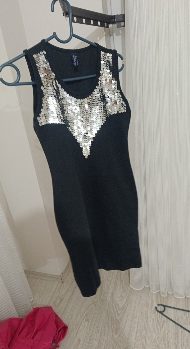 Kolsuz, v yakalı ve göğüs kısmında parlak pul detaylı, dar kesim mini elbise, partiler için ideal.