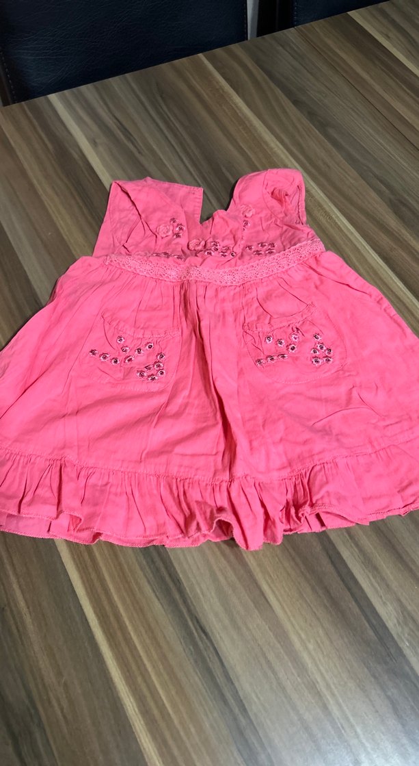 Renkli nakışlı ve fırfırlı detaylara sahip kolsuz, pembe elbise. Askısız yakalı ve bol kesim, yumuşak tekstil kumaştan. Bohem tarzda.