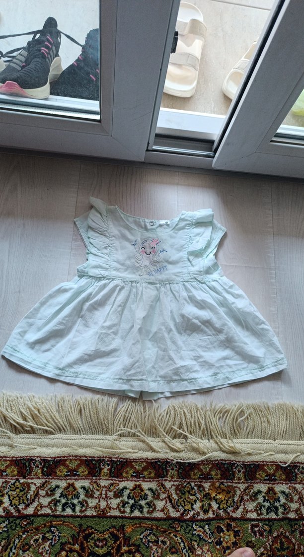 Kolsuz, nakışlı ve fırfırlı detaylara sahip turkuaz kız elbisesi. Pamuklu yumuşak kumaştan, bol kesim ve askısız yaka ile bohem tarzda.