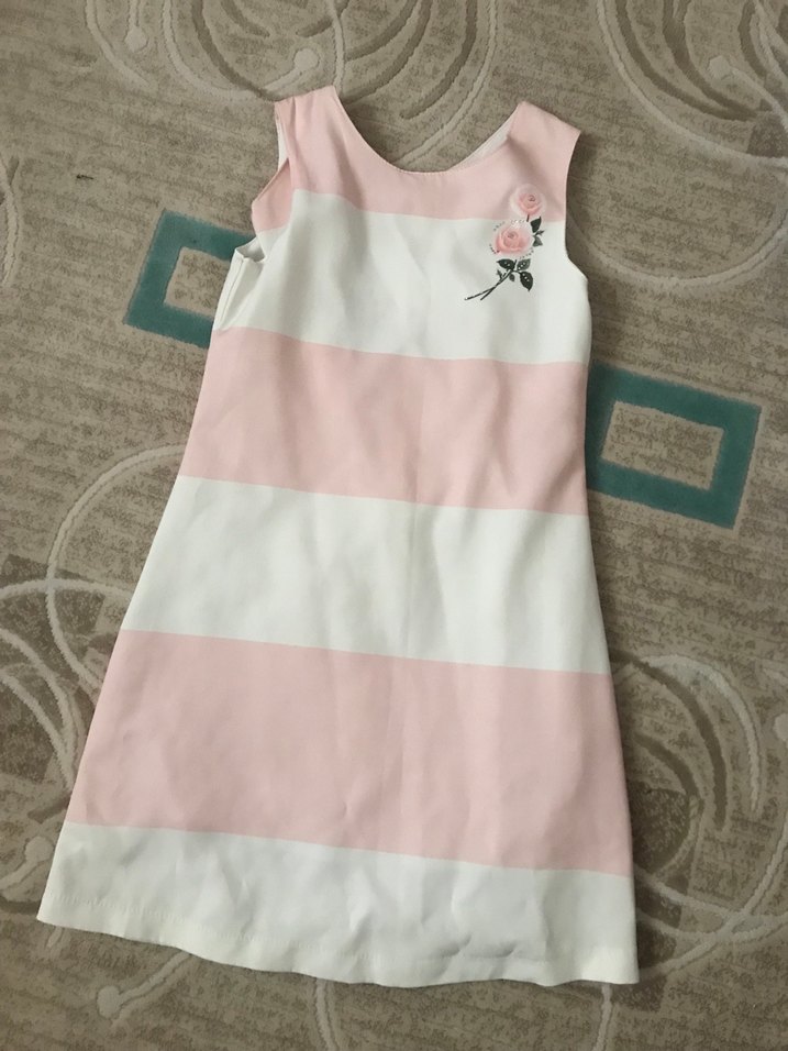 Kolsuz, pastel pembe ve beyaz renklerde, göğüs kısmında nakışlı çiçek detayı bulunan, askısız yakalı ve normal kesim kız elbisesi.