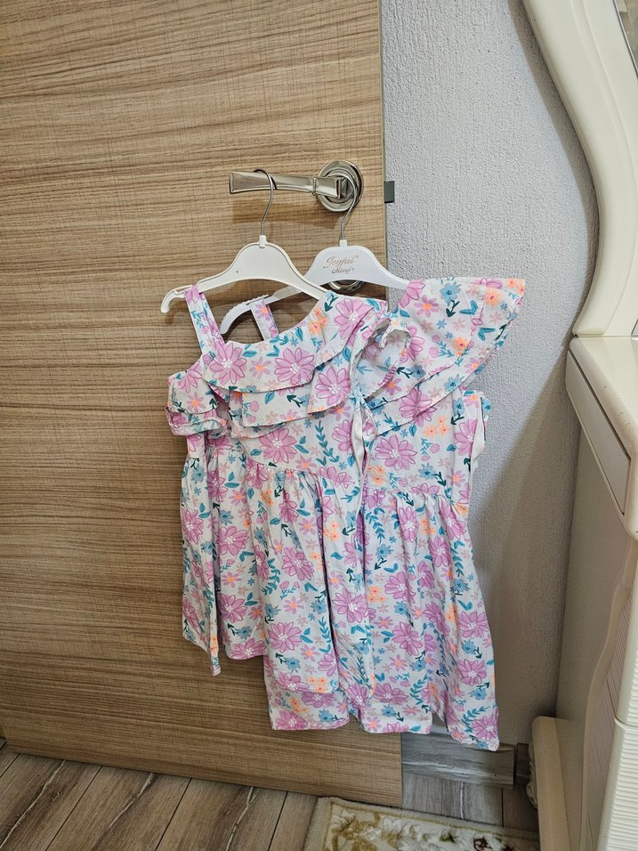 Kolsuz, fırfırlı ve bol kesim kız çocuk elbisesi. Pastel pembe çiçek desenli, yumuşak sentetik kumaştan bohem tarzda.