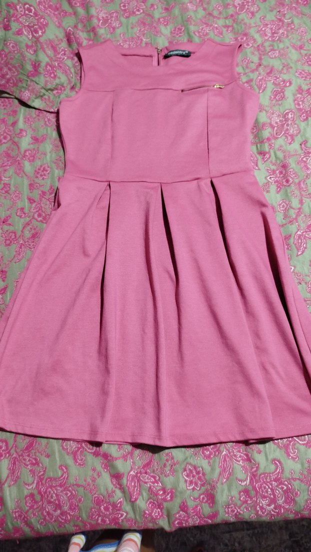 Kolsuz, pembe renk genç kız elbisesi. Yumuşak tekstil kumaştan, bol kesim ve yuvarlak yakalıdır. Fırfır detayları ile renkli ve rahat bir tarz sunar.