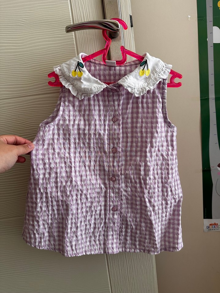 Kolsuz, düğmeli ve yakalı pembe kız çocuk elbisesi. Nakış detayları ve rahat kesimiyle pastel tonlarda.
