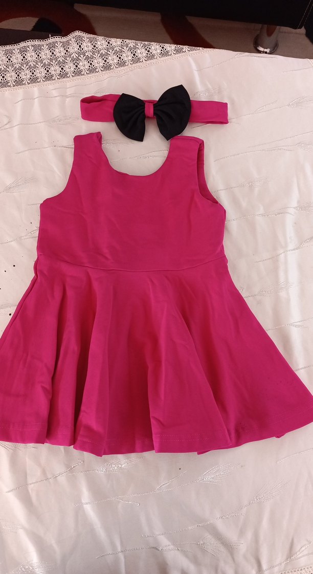 Kolsuz, tek renk pembe kız çocuk elbisesi, oturan kesim ve fırfırlı etek detaylı. Siyah fiyonklu saç bandı ile tamamlanmıştır. Tekstil sentetik kumaş.