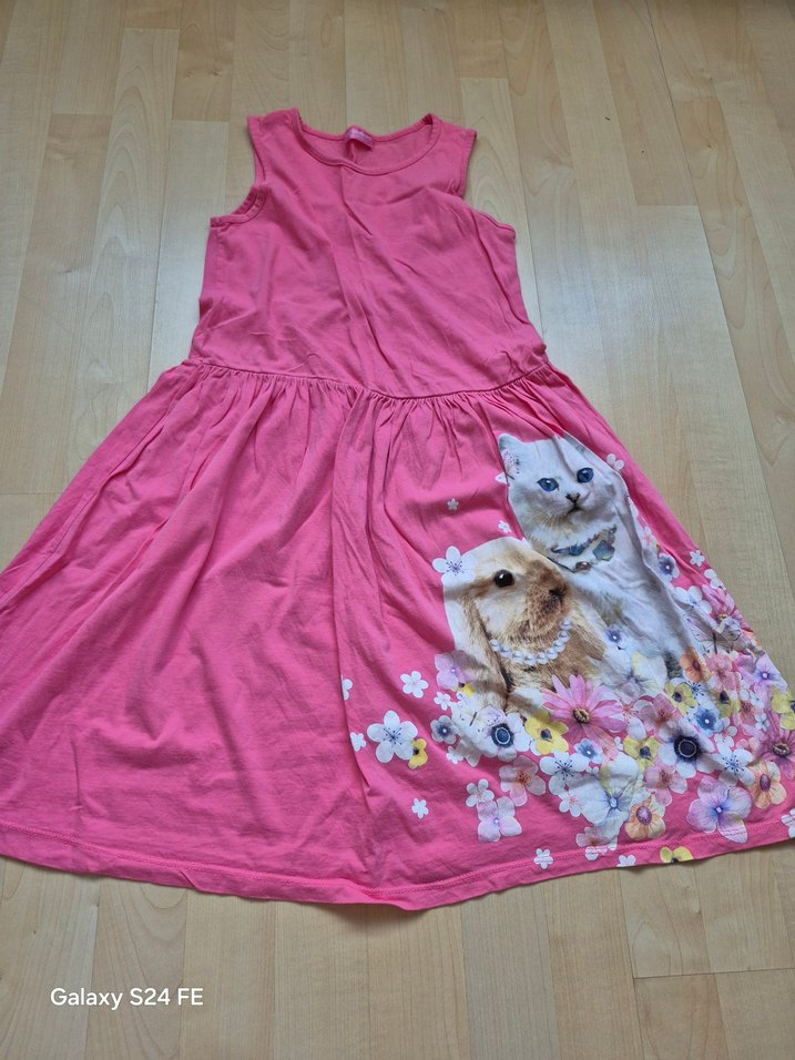 Kolsuz, salaş kesim pembe elbise, renkli hayvan ve çiçek baskılıdır. Yumuşak sentetik kumaştan, straplez yakalı ve drapeli tarzda.