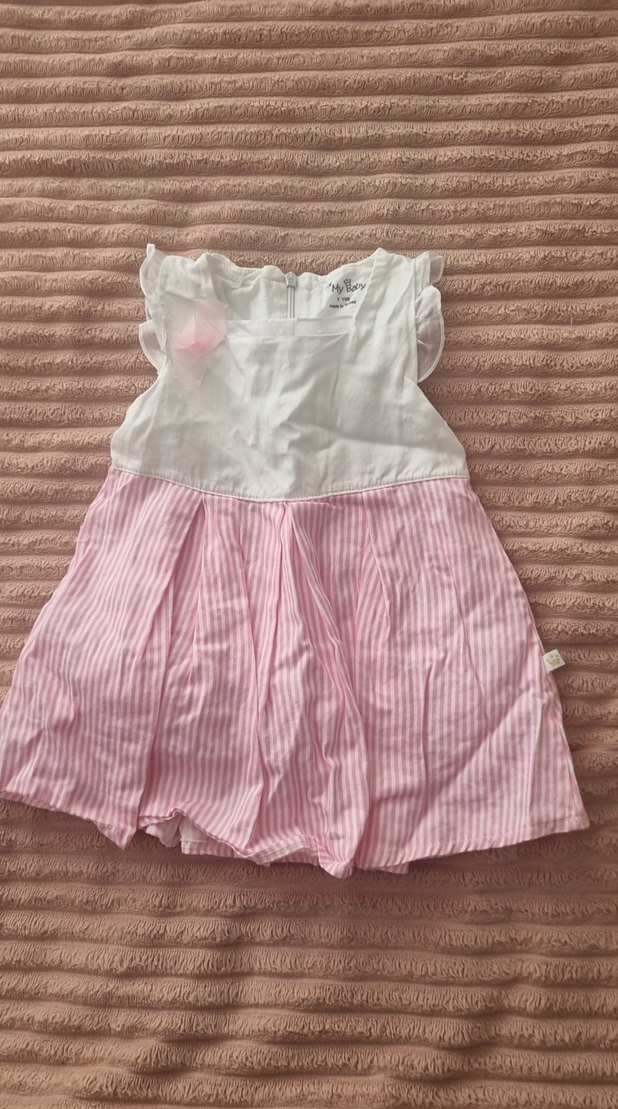 Kolsuz, pamuklu kumaştan yapılmış, pilili pastel pembe eteği ve beyaz üst kısmı olan, straplez yakalı bol kesim kız elbisesi.