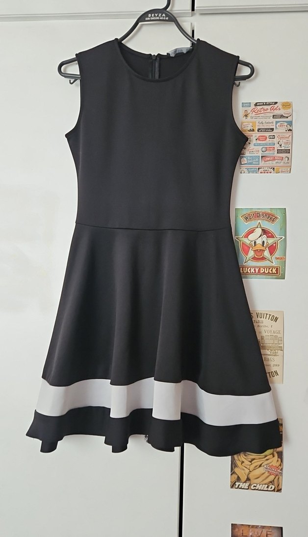 Kolsuz, yuvarlak yakalı siyah elbise, oturan üst kısmı ve piliseli etek kısmında beyaz baskılar bulunur.