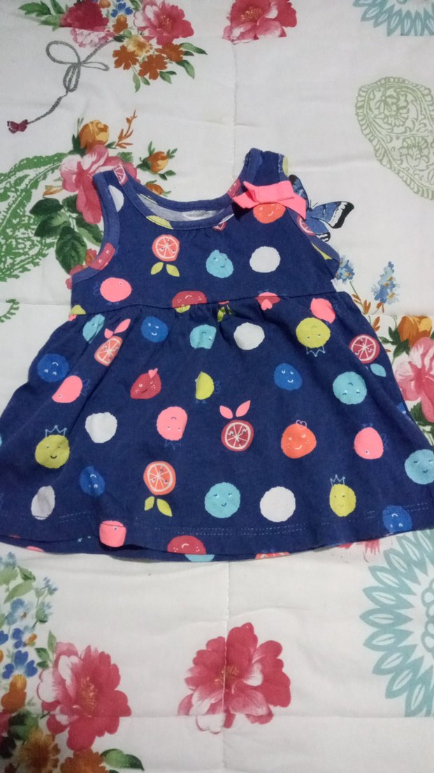 Kolsuz, renkli baskılı tekstil kumaştan yapılmış, oturan kesimli ve fırfır detaylı kız çocuk elbisesi. Canlı desenler eğlenceli bir hava katıyor.