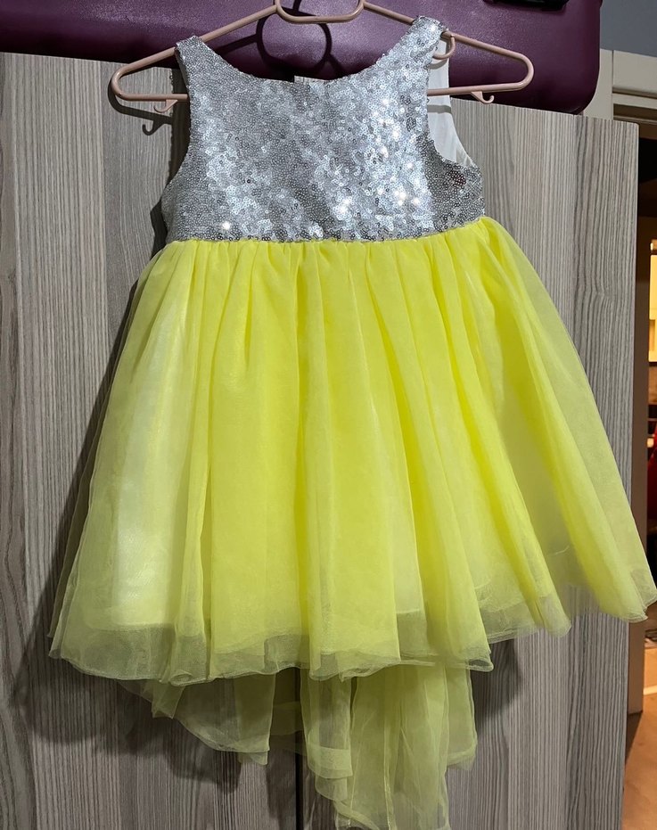 Parlak işlemeli askısız, vücuda oturan üst kısmı ve sarı fırfırlı eteği olan kız çocuk elbisesi. ✨