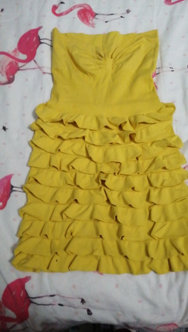 Kolsuz, askısız ve vücuda oturan bu sarı elbise, çok katlı fırfır detaylarıyla yumuşak sentetik kumaştan üretilmiştir. Xs s m uyumlu elastik kumaş