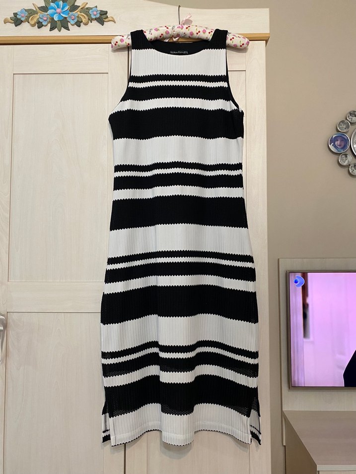 Siyah beyaz çizgili, midi boy, kolsuz, esnek kumaş elbise. Sadece 1-2 kez kullanıldı, herhangi bir sorunu yoktur. İçinde astarı mevcuttur, kullanımı oldukça rahat. Koltukaltı 48, bel 42, boy 120 cm.