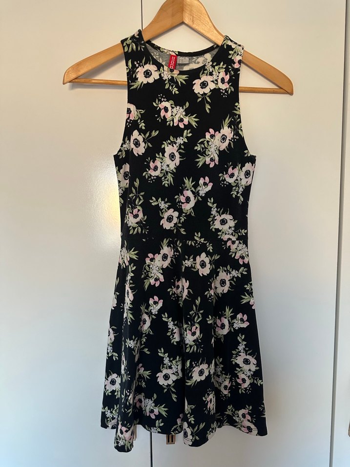 Kolsuz, çiçek desenli siyah midi elbise. Yüksek yakalı, oturan kesim ve pileli detaylara sahip.