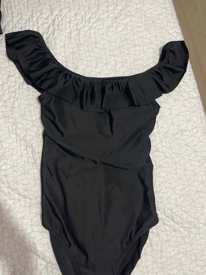 Kolsuz, fırfırlı detaylı, siyah ve vücuda oturan kadın mayo. Normal midi boyda, desensiz ve minimalist tarzda günlük kullanım için uygundur. Lcw ya da Trendyol milla