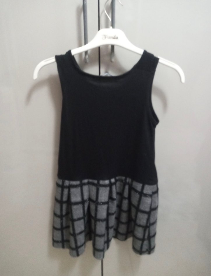 Kolsuz, yuvarlak yakalı ve bol kesim kız elbisesidir. Siyah üst kısmı, gri örgü ve kare desenli alt kısmıyla trendy ve rahat goth tarzı sunar. Sentetik kumaştan yapılmıştır.