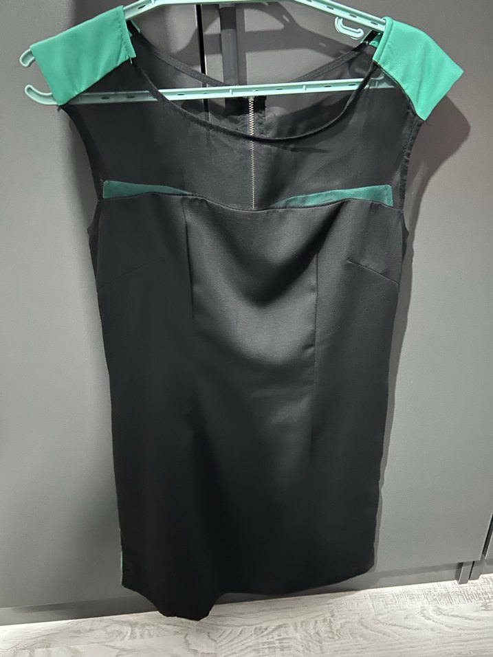 Kolsuz, V yakalı siyah midi elbise, bel detaylı ve regular fit. Omuzlarda yeşil detaylarla ofis için uygun şık bir model.